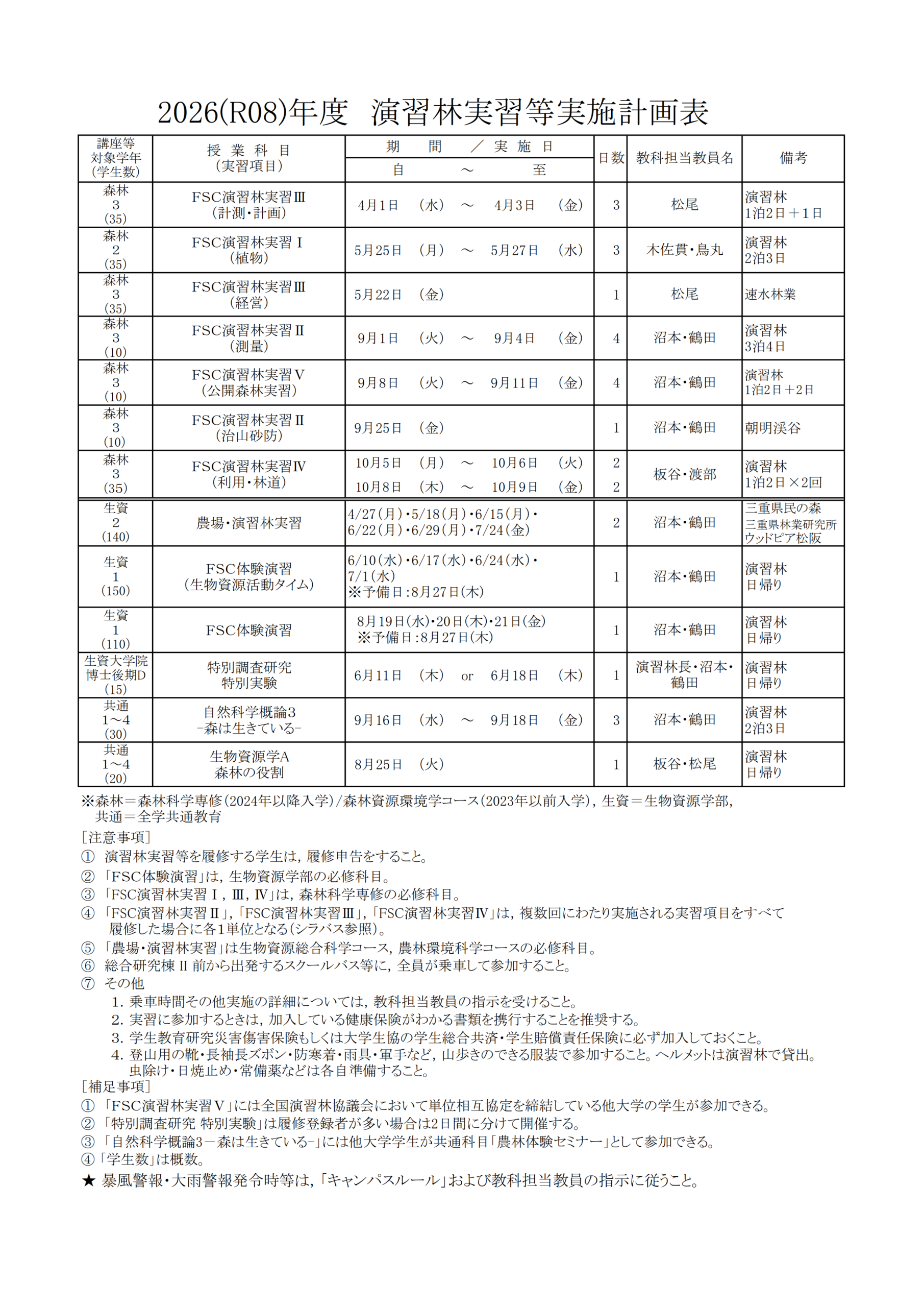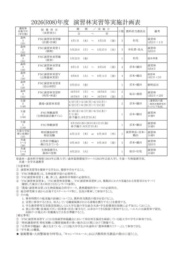 2026(令和8)年度 演習林実習等実施計画表 (クリック・タップで拡大) 2024年度 公開森林実習(三重大学 FSC演習林実習Ⅵ) 2024年度の公開森林実習は9月10日(火)~13日(金)を予定しています。詳細についてはこちらのページをご覧ください。